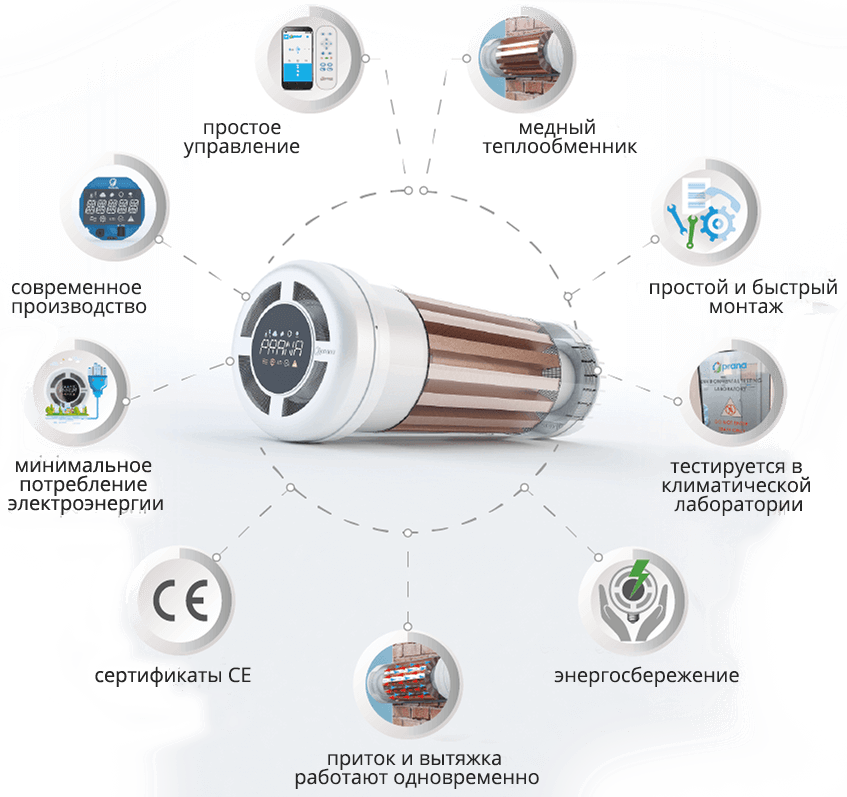Система удаляет из помещения воздух, загрязненные микрочастицами пыли и дыма, обеспечивает приток свежего и чистого воздуха извне. При этом приточный и вытяжной воздух проходит по разным каналам теплообменника и не смешивается.